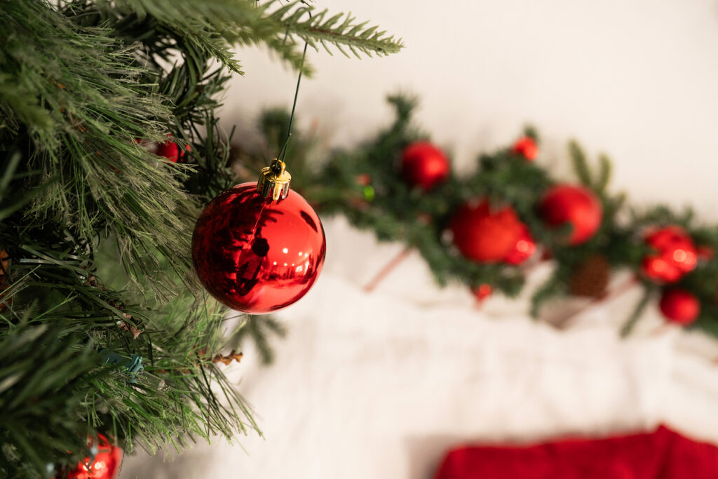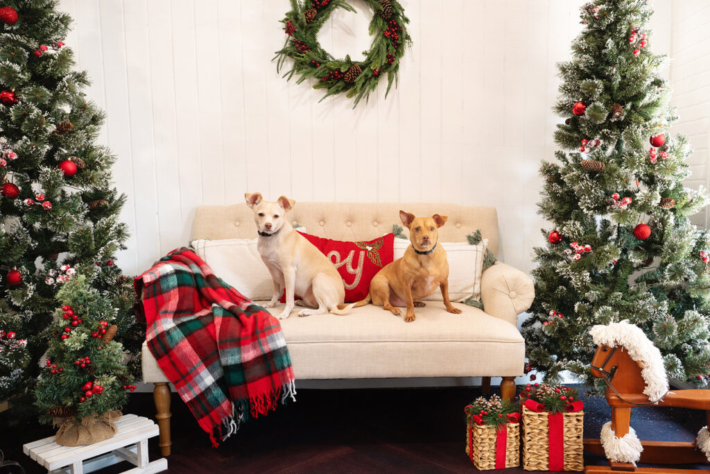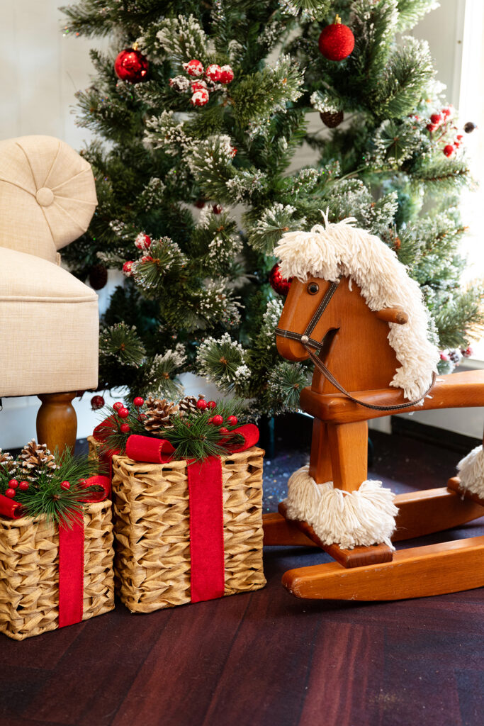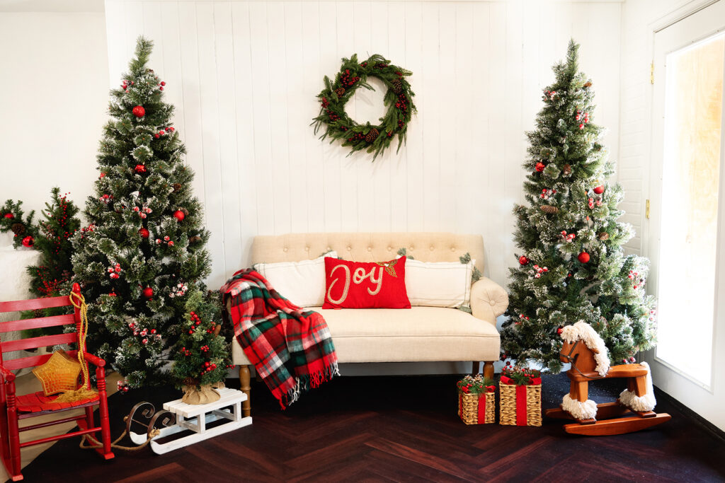 Elegant Settee Scene – Sparkling trees and pops of festive red that’s perfect for a casual or dressed up holiday look.